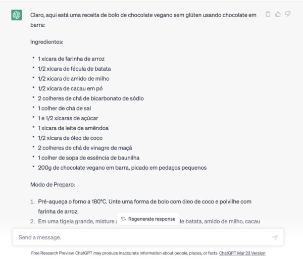 Domingo passado fez um friozinho e me deu vontade de bolo de chocolate. Por incrível que pareça, não tenho nenhuma receita boa de bolo de chocolate vegano, como eu estava com preguiça e sem ideias para criar, pedi ao ChatGPT para escrever para mim. E o resultado foi surpreendente!