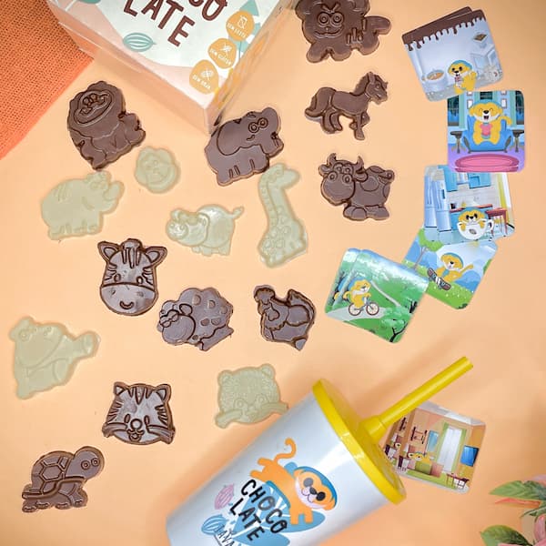 O kit de chocolates em formato de bichinhos acompanha um copo com canudo e embalagem com caça palavras.